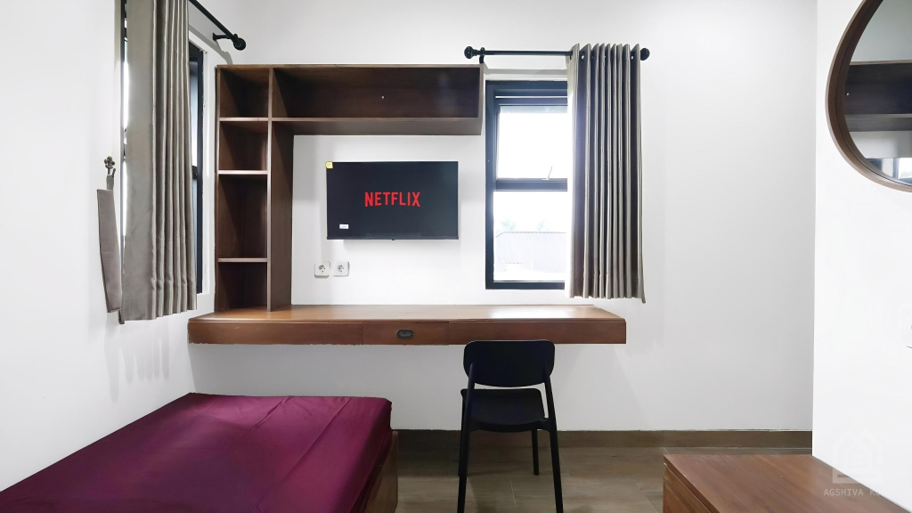 Kamar B02 berada di sisi depan kiri lantai 2, dengan dua jendela besar yang menghadirkan cahaya alami berlimpah. Kamu akan merasakan suasana terang dan segar setiap hari.