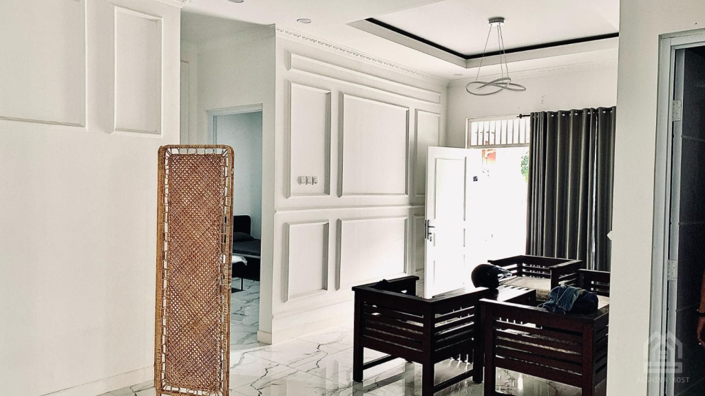 Bagian dalam rumah sudah dilengkapi keramik motif lantai marmer elegan dengan pencahayaan yang nyaman, sementara bagian luar memiliki teras klasik dengan pilar cantik.